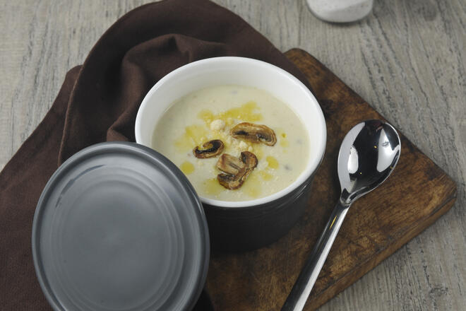 Creamy mushroom soup seasoned with truffle oil, topped with grated parmesan and mushrooms.