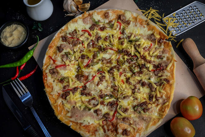 Sisig, bell peppers, and cheese.