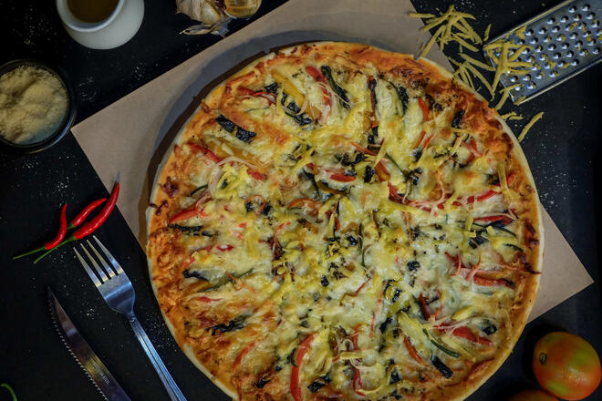 Chubs’s signature recipe made with rich and thick tomato purée, seasoned with traditional herbs and spices, topped with cream and parmesan.